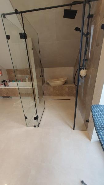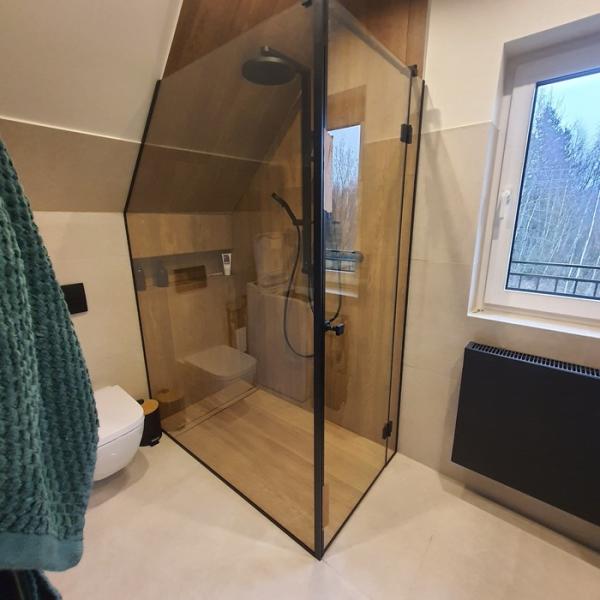 Wykonujemy kabiny w systemie przesuwnym oraz otwierane. Dopasowujemy kształt kabiny do skosów w pomieszczeniach.